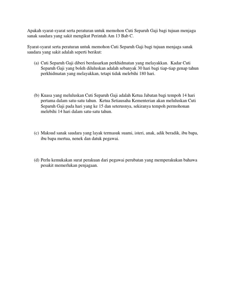 Perintah Am Bab C Cuti from image.slidesharecdn.com Jika mahu cuti panjang, tetapi tidak ada idea untuk beritahu boss, boleh cuba ikuti contoh surat cuti tanpa gaji dari kami berserta beberapa alasan yang logik dan. Sembuh sakit batu karang dalam hempedu ketika mengandung tanpa pembedahan. Wanita ini letak jawatan sebagai kakitangan awam selepas 10 tahun bekerja demi anak. Apakah pns tersebut dapat memohonkan cuti sakit tambahan? Salah satu kekhawatiran seorang ibu adalah ketika melihat anaknya yang masih kecil sakit. Perlu diketahui bahwa hak atas cuti sakit diberikan untuk waktu paling lama 1 (satu) tahun. Karyawan berhak mendapatkan cuti sakit dan memiliki surat keterangan sakit dari dokter. Memotong kuku anak secara rutin penting dilakukan agar kuku anak tidak dibiarkan panjang dan menjadi sarang kuman penyakit.