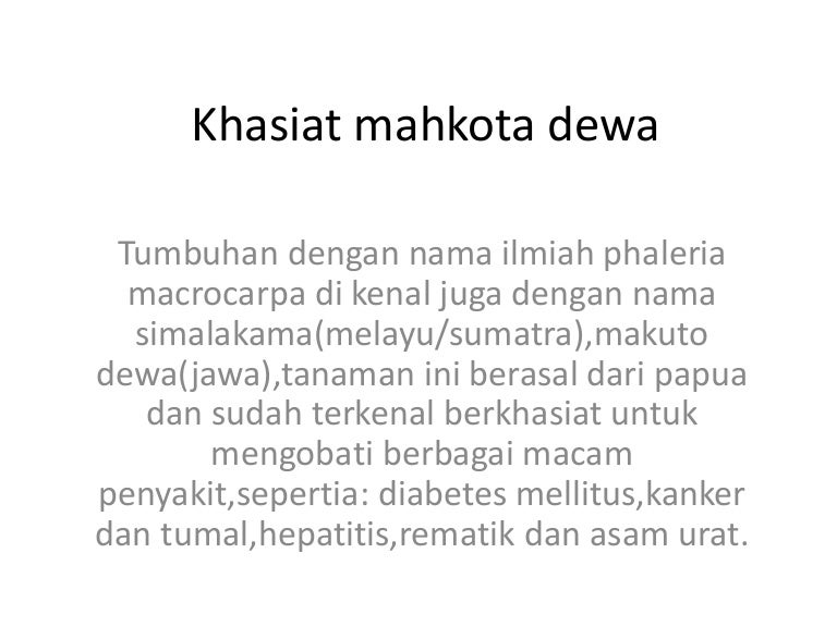 Khasiatnya dalam mengobati berbagai macam penyakit, khususnya diabetes melitus, membuat tanaman ini dikenal banyak orang. gram daging buah mahkota dewa yang telah kering di campur dengan * gram temu putih. Mahkota dewa atau phaleria macrocarpa dalam bahasa latin ialah salah satu jenis tanaman yang asli dari papua, indonesia. Sifat dan khasiat mahkota dewa. Pada masa lampau hanya masyarakat indonesia sahaja yang mengetahui khasiat mahkota dewa.