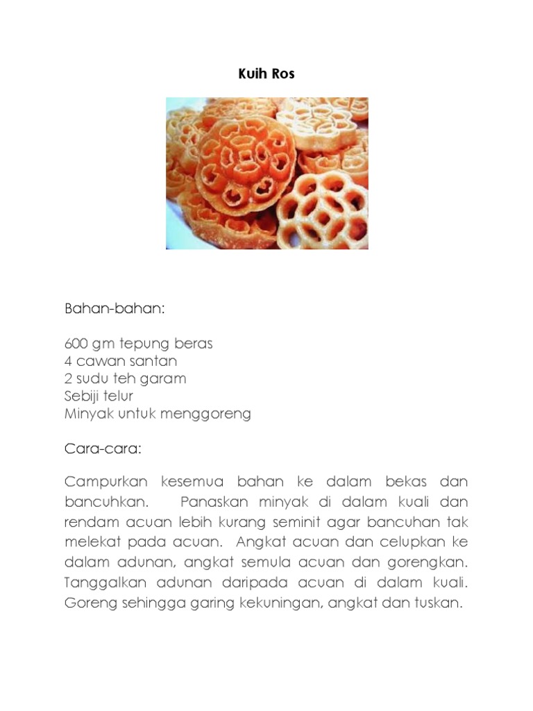 Resepi kuih muih melayu simple sedap. Masyarakat di daerah padang terap, kedah menamakan sajian ini sebagai kuih goyang. Tuang bancuhan kuih kaswi dalam acuan. Mesti dah tak sabar kan nak rasa sendiri resepi kuih cara manis. Ini kerana selepas acuannya dicelup ke dalam adunan tepung cair, acuan tersebut dicelup ke dalam minyak. Gris acuan kuih cara dengan minyak masak. Buat dalam acuan kuih lompang, bagi fun sikit. Dulu kalau goreng ikan mesti hancusssss ( sebab teror masak kan, muhahahhaa ). Kuih loyang juga dikenali sebagai kuih ros, kuih bunga durian, kuih cap dan kuih goyang. Jadi kalau nak kenal kuih ni rasa macam mana. Dalam masyarakat melayu kita lebih dikenali dengan nama kuih goyang atau kuih ros. Group loyang & acuan has 100,373 members. Jom layan resepi di bawag ini.