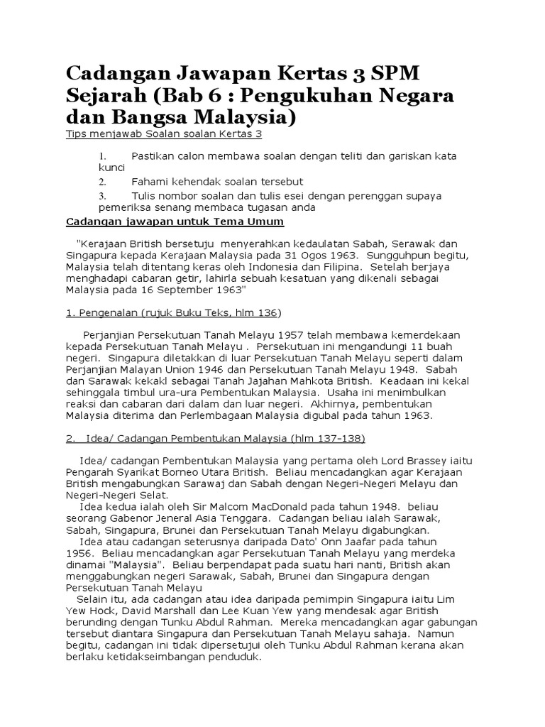 Berikut dikongsikan maklumat penting berkaitan contoh soalan dan skema jawapan pemb inaan negara dan bangsa ke arah kemunculan negara malaysia berdaulat bagi mata pelajaran sejarah kertas 3 spm: Koleksi soalan percubaan spm 2016 (trial examination papers) source: Penubuhan malaysia akan mempercepat kemerdekaan sarawak, sabah, singapura dan brunei kerana pada masa ini negeri berkenaan masih belum mampu berkerajaan sendiri. Sarawak dan sabah ke dalam malaysia diharapkan dapat menjadi benteng yang kukuh bagi menghadapi ancaman komunis. Soalan isi dan huraian markah 1 latar belakang pembentukan malaysia ( 8x1m=maksimum 5) :