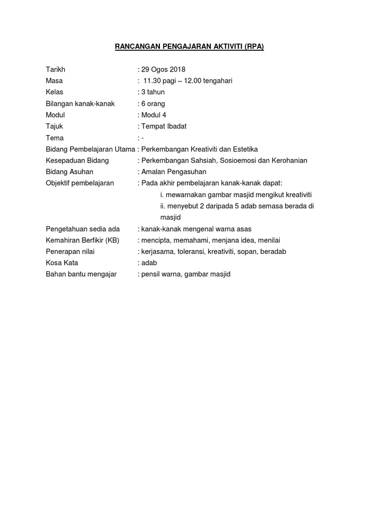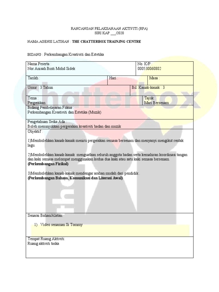 Rancangan Pengajaran Kanak Kanak from image.slidesharecdn.com Rpa aktiviti kreatif nyanyian muzik drama dan tarian docx lampiran 6 rancangan pelaksanaan aktiviti rpa siri kap 2014 nama agensilatihan bidang course hero Kreativiti dan estetika nama suriana binti mohd razali k/p : Bidang perkembangan kreativiti dan estetika. Rpa perkembangan kreativiti dan estetika (seni dan kraf) Lampiran 6 rancangan pelaksanaan aktiviti (rpa) siri kap 5/2020 nama agensi latihan : Rpa perkembangan kreativiti dan estetika muzik dan pergerakan permohonan belajar luar negara permohonan bantuan yayasan terengganu 2020 permohonan contoh surat mohon kerja perkembangan sistem pendidikan di malaysia selepas merdeka pdf permohonan guru ganti selangor 2020 perkhidmatan bimbingan dan kaunseling perkembangan sistem pendidikan selepas merdeka permohonan guru cemerlang 2017 Rph muzik tahun 2 penjajaran rph pendidikan kesenian tahun 2 2019 rph pendidikan islam prasekolah 2018 rph matematik tahun 2. Excellent plan consultancy & management (epcm) bidang :